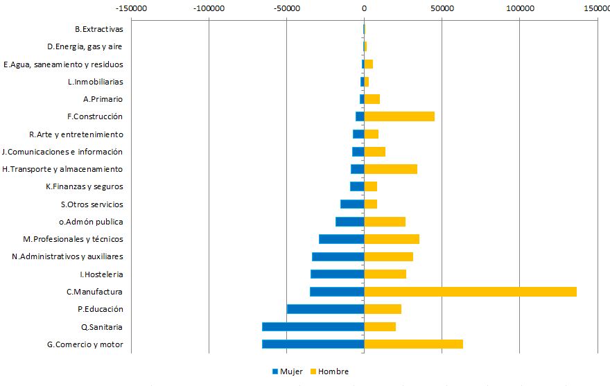 El empleo femenino es proporcionalmente mayor que el masculino en las actividades 'Sanitarias y de servicios sociales' así como en las actividades 'Educativas'.