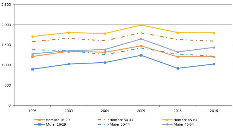 En la población menor de 30 años, especialmente en las mujeres, la cifra de 2013 alcanza un mínimo histórico por debajo de los 1.000 euros, y en 2016 parece recuperar pero la cifra aún recuerda la del año 2000. La remuneración salarial más alta corresponde a los hombres entre 45 y 64 años, con una brecha salarial entre mujeres y hombres del 20%.