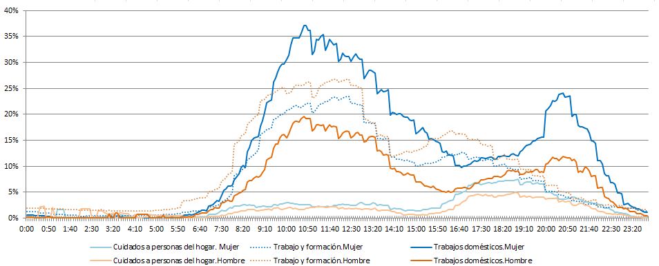 Según cifras de 2013, entre las 10:00 y las 13:00 horas de un día tipo más de un 30% de las mujeres y algo más del 15% de los hombres se ocupan en 'trabajos domésticos'.