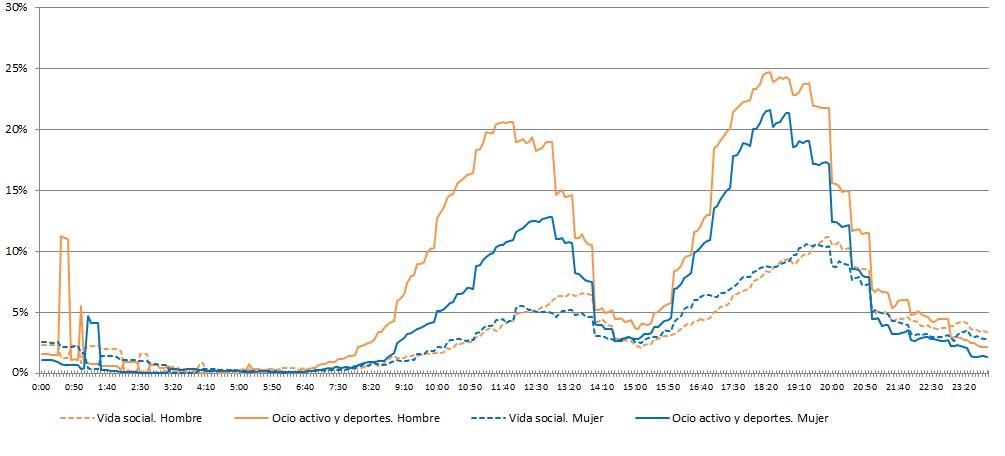 Entre las 6 y las 7 de la tarde es el momento de mayor afluencia (más del 20% de los hombres y mujeres). Los hombres no sólo participan en mayor medida que las mujeres, (las tasas son más elevadas) sino que además sus intervalos horarios también son más amplios. A partir de las 21:00 el ocio activo de las mujeres desciende al 4,5% mientras el de los hombres desciende a esa cifra una hora y media más tarde.