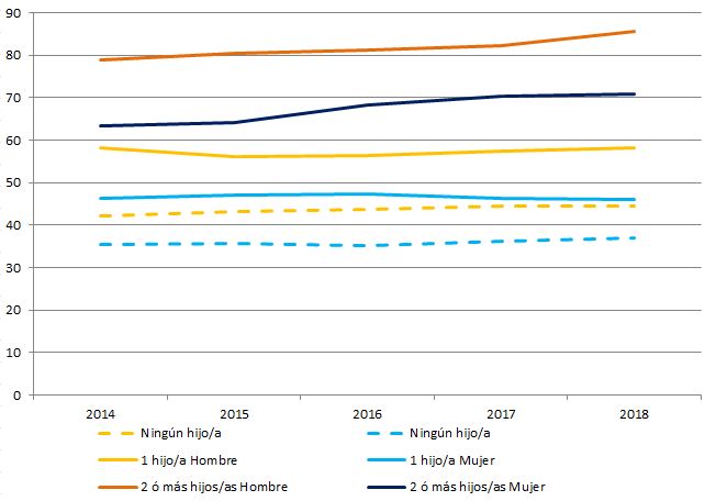 Tasa de ocupación de la población de 16 y más años de la C.A. de Euskadi según número de hijos e hijas a su cargo y sexo (%). 2014-2018.