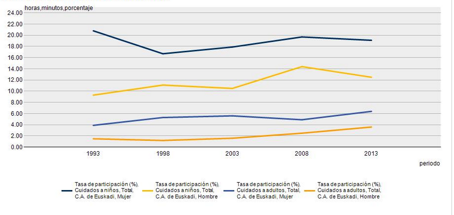 El tiempo (medio por participante) de las mujeres cuidando menores se cifra en 1:29 y el de los hombres en 1:10, según cifras de 2013. El tiempo medio (por participante) de las mujeres cuidando adultos se cifra en 1:41 y el de los hombres en 1:25. La tasa de participación en los cuidados a menores no aumentó en el periodo señalado pero sí la referente a los cuidados a personas adultas.