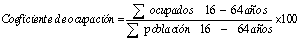 Se llama coeficiente de ocupación de un grupo a la proporción de miembros del mismo que se encuentra ocupado. Suele expresarse en porcentajes. En el CMT están calculadas sobre la población de 16 a 64 años (edad cumplida).