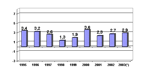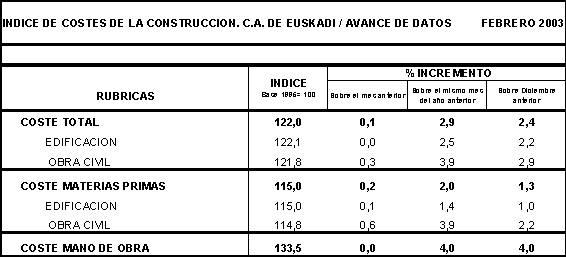 Entre los precios de las materias primas consumidas por el sector que han experimentado mayores tasas de inflación en febrero de 2003 figuran Derivados del petróleo (6,1%), Pinturas y barnices (0,9%) y Productos asfálticos (0,6%). En sentido contrario, han registrado reducciones en sus precios medios mensuales las materias primas de Explosivos y gases (-2,9%), Vidrio (-1,0%) y Cemento artificial (-0,1%), entre otras.
