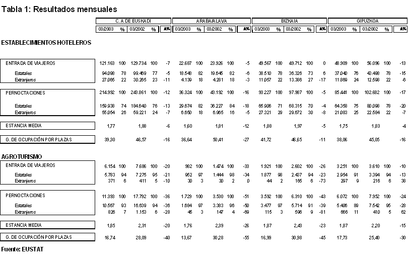Las pernoctaciones registradas en marzo de 2003 se cifran en 214.992, es decir, casi 39.000 menos que en el mismo mes del año anterior, lo que representa una reducción del 12%. El número de pernoctaciones disminuye en los tres territorios aunque con diferente intensidad, ya que en Bizkaia disminuye un 5%, mientras que en Alava y Gipuzkoa el descenso es más acusado, con un -16% y -17%, respectivamente.