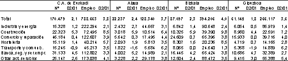El 62,6% del personal recogido en el directorio se encuentra en el sector de servicios, seguido de la industria, 28,2%, y de la construcción, 9,2%. El máximo de ocupación estructural de la industria por territorios se encuentra en Alava, donde alcanza el 34,8% del personal ocupado, seguido de Gipuzkoa, 32,7%, y a gran distancia Bizkaia, 23,0%. Este territorio se encuentra a la cabeza en porcentaje de personal ocupado en el sector servicios, 67,0%, y en la construcción, 10,0%.