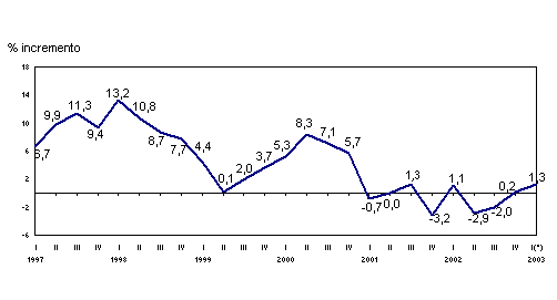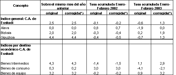 La producción industrial de la C. A. de Euskadi en febrero de 2003 creció un 2,5% con respecto al mismo mes del año 2002, según datos elaborados por EUSTAT. La tasa acumulada de crecimiento para los dos primeros meses del año, con respecto al mismo período del año anterior, ha obtenido un crecimiento del 1,3%, en términos homogéneos de calendario laboral, pero un descenso del 0,6%, en términos absolutos.