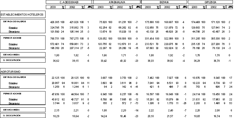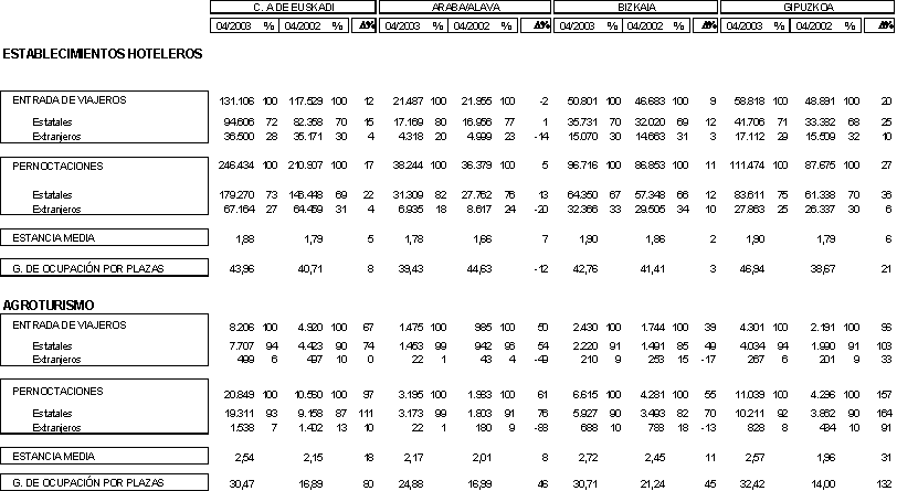 Pero si se analizan los datos del primer cuatrimestre de 2003 en relación con los resultados del mismo período de hace un año, la comparación se hace más homogénea al desaparecer el efecto estacional del calendario de fiestas de Semana Santa, que el año pasado caía en marzo y este año en abril. Así, en los primeros cuatro meses de 2003 se han contabilizado 426.385 entradas de viajeros, 5.000 más que el año anterior, y las pernoctaciones se elevan a 768.751, es decir, 1.500 más que en el mismo período de 2002. Tanto las entradas de viajeros como las pernoctaciones han registrado crecimientos en Bizkaia y Gipuzkoa en el período del primer cuatrimestre. Las entradas de viajeros han aumentado un 2% en Gipuzkoa y un 4% en Bizkaia. Las pernoctaciones han incrementado un 2% en Gipuzkoa y un 3% en Bizkaia. En cambio las dos variables presentan descensos en Alava para el conjunto de los cuatro primeros meses del año: las entradas de viajeros (-7%) y las pernoctaciones (-9%).