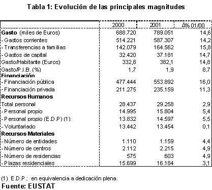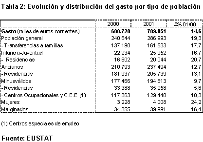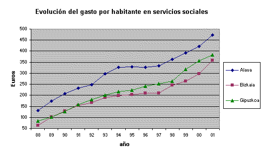 El gasto en servicios sociales en la C.A. de Euskadi alcanzó en 2001 la cifra de 789 millones de euros, un 15% más que el año anterior, lo que representó un 1,9% del PIB vasco. El gasto medio por habitante se situó en 382 euros, según datos de EUSTAT.