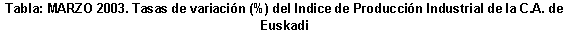 En el mes de marzo de 2003, las variaciones interanuales más positivas han correspondido a los sectores de "Textil y confección" (24,4%), "Industria química" (18,7%), "Material eléctrico" (17,8%), "Caucho y plástico" (17,5%), "Material de transporte" (14,8%), "Metalurgia y artículos metálicos" (11,4%) e "Industria no metálica" (11,1%).