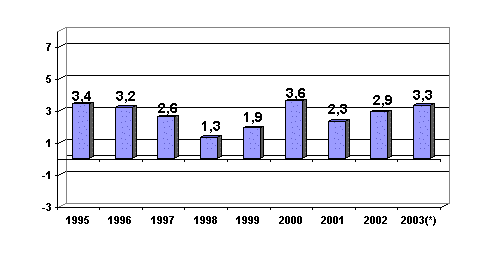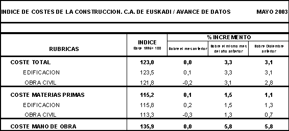 Entre los precios de las materias primas consumidas por el sector que han experimentado mayores tasas de inflación en mayo de 2003 figuran: Vidrio (4,5%), Cal, yeso y escayola (2,0%), Energía eléctrica (1,7%) y Hierro y acero (0,9%). En sentido contrario, han registrado reducciones en sus precios medios mensuales las materias primas de Derivados del petróleo (-4,7%), Tubería de plástico (-0,4%) y Explosivos y gases (-0,2%), entre otras.