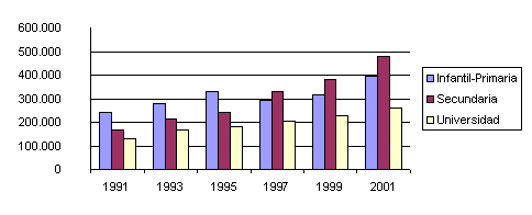 El ingreso total de los centros públicos se cifró en 1.183 millones de euros, correspondiendo a ingreso corriente el 92,4 % y a ingreso de capital el 7,6%. La financiación pública supone el 93% del ingreso total, siendo la principal fuente el Departamento de Educación, con un 86%, seguido de los ayuntamientos con el 5,3%. Las fuentes privadas aportaron un 5,5% del total, principalmente a través de cuotas de enseñanza, 3,3%, y de actividades y servicios complementarios, 0,2%.
