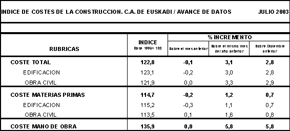 Entre los precios de las materias primas consumidas por el sector que han experimentado mayores tasas de inflación en julio de 2003 figuran: Derivados del petróleo (4,1%), Energía eléctrica (2,7%), Tierras cocidas (0,3%) y Aridos de extracción (0,3%). En sentido contrario, han registrado reducciones en sus precios medios mensuales las materias primas de Vidrio (-2,7%), Hierro y acero (-1,8%) y Explosivos y gases (-1,6%), entre otras.