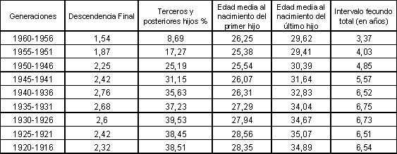 Y las mujeres de la siguiente generación, las nacidas entre 1956 y 1960, que prácticamente ya han acabado su vida fecunda, apenas superan los 1,5 hijos de descendencia final. Las razones que explican el no reemplazo generacional se hallan en una disminución drástica de los terceros y posteriores hijos que, de suponer el 36% del total de hijos en las mujeres de las generaciones de 1941 a 1945, han pasado al 9% en las nacidas entre 1956 y 1960. Esta disminución del número total de hijos ha tenido como consecuencia la concentración del período fecundo en unos pocos años. Si las generaciones de 1936 a 1940 tenían sus hijos en un intervalo de 6,5 años, las mujeres nacidas 20 años después los tienen en 3,4 años.