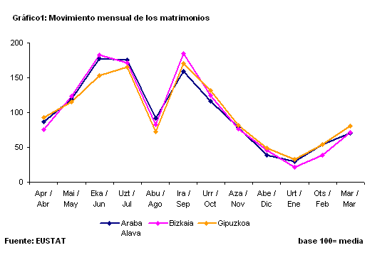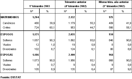 Como viene ocurriendo en años anteriores, en este trimestre se da la mayor proporción de matrimonios civiles, superando en número a los religiosos, por lo que parece consolidarse este hecho. Por territorios históricos, fueron los alaveses los que mayor número de bodas civiles celebraron (73%), lo que representa un aumento muy significativo sobre el mismo período del año anterior en el que la proporción fue del 64%. Bizkaia y Gipuzkoa, con el 59%, mantienen el mismo porcentaje que en el primer trimestre de 2002. En el caso de residentes fuera de la Comunidad Autónoma que celebraron su boda en la misma, este porcentaje se situó en el 30%.