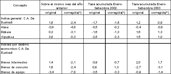 En el mes de setiembre de 2003, las variaciones interanuales más positivas, en términos absolutos, han correspondido a los sectores de “Refino de petróleo” (18,2%), "Industria de la madera" (11,7%), "Material eléctrico" (10,1%), "Energía eléctrica, gas y agua" (6,0%) e " Industria de la alimentación" (5,5%).