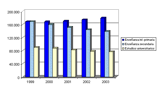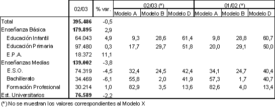 En Educación Infantil el 61,4% de los alumnos cursaron los estudios en el modelo D, en el B lo hicieron un 28,6% y solamente un 9,3% siguieron el modelo A. En Educación Primaria, el modelo D fue también mayoritario con el 51,8%del alumnado, mientras que el modelo B ocupó el segundo lugar con un 29,7% y el A el tercero con un 17,7%. Tanto en la ESO como en Bachillerato, la proporción de alumnado que estudió en euskera supera ligeramente el 40%, mientras que en Formación Profesional desciende a un 13,6%. De todas formas, en líneas generales, la tendencia en todos los niveles es un aumento de matriculaciones en el modelo D con respecto al año anterior.