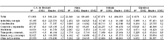 Por ámbitos territoriales, en Bizkaia la creación de empleo ha sido superior a la media vasca, con una tasa del 2,6%, mientras que en Gipuzkoa y Alava se sitúa por debajo, con tasas del 1,9% y 1,6%, respectivamente. Construcción ha sido el sector con mayores crecimientos territoriales en sus respectivos ámbitos. Por otra parte, destaca la evolución de la rama de Hostelería, con disminución de establecimientos en todo el ámbito vasco pero con aumento de empleo. Es significativo el caso de este sector en Bizkaia, con una pérdida del 2,3% de establecimientos y, sin embargo, un aumento del 5,5% en su empleo.