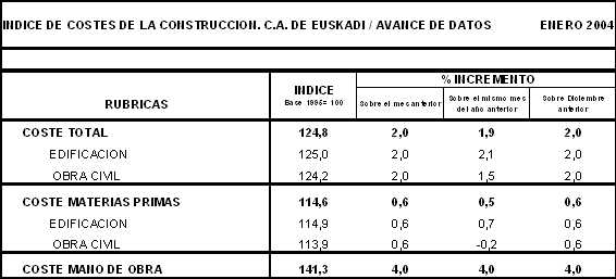 Entre los precios de las materias primas consumidas por el sector que han experimentado mayores tasas de inflación en el conjunto de los últimos doce meses figuran: Materiales de limpieza y aseo (7,9%), Cal, yeso y escayola (6,4%), Hierro y acero (4,9%), Tubería metálica (3,4%) y Aridos de extracción (2,4%). Por otra parte, han registrado reducciones en sus precios interanuales (enero de 2004 sobre enero de 2003), las materias primas de Productos asfálticos (-10,8%), Productos derivados del petróleo (-8,9%), Prendas de trabajo (-4,4%), Energía eléctrica (-3,8) y Tubería de plástico y aislantes térmicos (-3,3%).