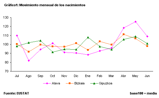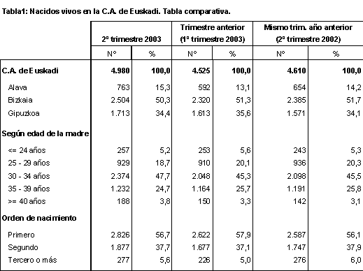 En el segundo trimestre de 2003 se registraron 4.980 nacimientos, según datos de Eustat, lo que supone un incremento del 8% respecto al mismo período del año anterior. Por territorios, en Álava nacieron 763 niños, con un crecimiento del 16,7%, en Bizkaia, con 2.504 nacimientos, el porcentaje de crecimiento se situó en el 5%, mientras Gipuzkoa registró un incremento del 9%, con 1.713 nacimientos.