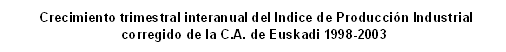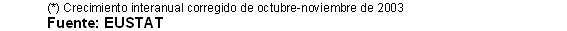La producción industrial de la C. A. de Euskadi en noviembre de 2003 ascendió un 1,3% con respecto al mismo mes del año 2002 en términos absolutos, según datos elaborados por EUSTAT. En términos homogéneos de calendario laboral, la variación interanual asciende a un 1,6%. La tasa acumulada de crecimiento para los once primeros meses del año, con respecto al mismo período del año anterior, ha obtenido un crecimiento del 1,5% en términos absolutos y del 1,2% en términos homogéneos de calendario laboral.