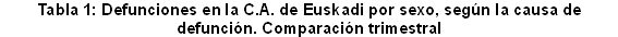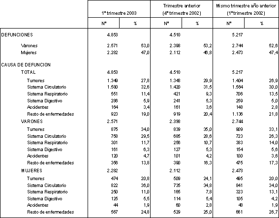 Tradicionalmente el primer trimestre del año se caracteriza por ser el que mayor número de defunciones contabiliza, siendo las enfermedades del aparato respiratorio las que registran los mayores incrementos en el número de defunciones. Este año el incremento de las defunciones causadas por enfermedades del sistema respiratorio respecto al trimestre anterior ha sido del 30,8%. Sin embargo, es destacable su menor incidencia respecto al mismo trimestre del año anterior, con un 22% menos de defunciones por esta causa. En consecuencia, las enfermedades del aparato respiratorio han pasado a suponer el 11,4% del total de defunciones, dos puntos menos que en el primer trimestre del 2002.