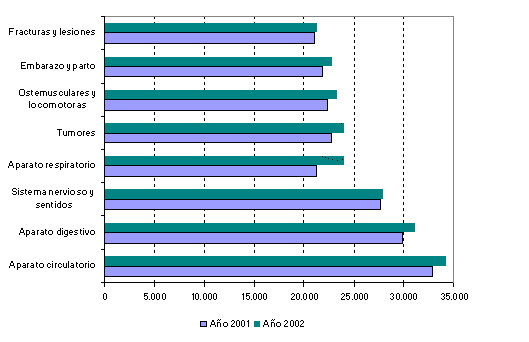 En comparación con el año 2001, destaca el aumento de los ingresos hospitalarios por causa de enfermedades respiratorias (13,4%) y, en especial, los casos de bronquitis crónica, que crecieron un 19,5%. Este hecho supone que las enfermedades respiratorias pasen de la séptima a la cuarta posición dentro del ranking de enfermedades con mayor ingreso hospitalario, por delante del grupo de enfermedades tumorales, osteomusculares y de las complicaciones por embarazo y parto. Del resto de enfermedades más frecuentes, aumentaron los ingresos por tumores en un 6,1% respecto al año anterior.