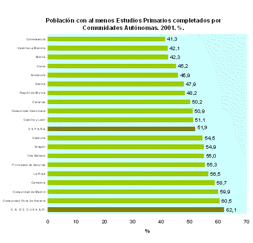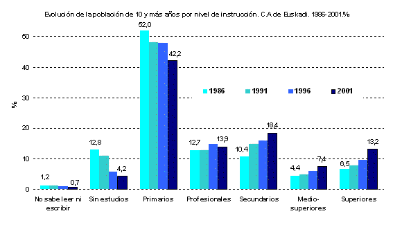 La pérdida de estudiantes resulta generalizada para todos los municipios de la C.A. de Euskadi entre 1996 y 2001. Destacan, entre los municipios de más de 40.000 habitantes, Basauri (-4,5%) y Santurtzi (-4,3%), que son los que presentan un mayor descenso. Donostia-San Sebastián (-1,7%) y Bilbao (-2,3%) acusan una menor pérdida que la media de la Comunidad Autónoma, situada en –2,9%.