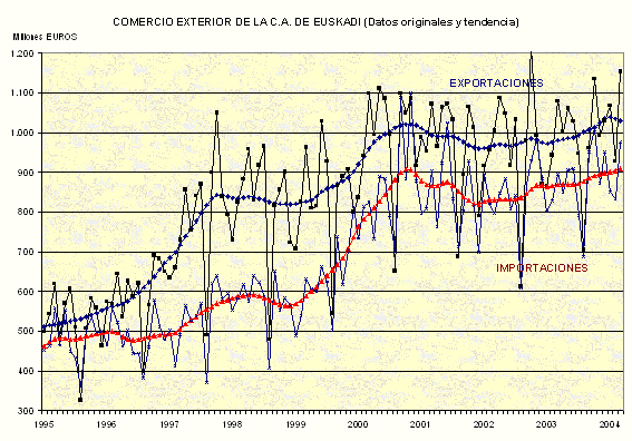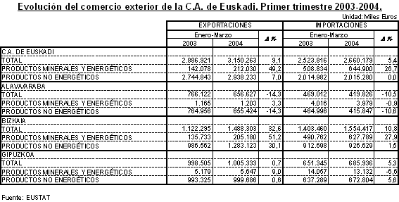 Las exportaciones de la C.A. de Euskadi han experimentado un crecimiento del 9,1% en el primer trimestre de 2004, según datos elaborados por EUSTAT. La cifra total de las exportaciones de los tres primeros meses del año asciende a 3.150,3 millones de euros, frente a los 2.886,9 millones del año anterior.
