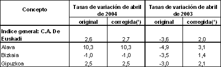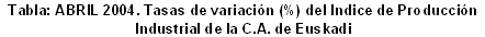 En el mes de abril de 2004, las variaciones interanuales más positivas, en términos absolutos, han correspondido a los sectores de "Energía eléctrica, gas y agua" (19,0%), "Material eléctrico" (13,1%), "Industria de la alimentación" (10,3%), "Refino de petróleo" (9,0%) y "Textil y confección" (8,4%). En contraposición, los sectores que han experimentado tasas interanuales más negativas han sido "Industria no metálica" (-11,3%), "Industria del cuero y calzado" (-6,1%), "Otras manufactureras" (-5,9%), "Papel, edición y artes gráficas" (-3,6%) y "Metalurgia y artículos metálicos" (-2,3%).