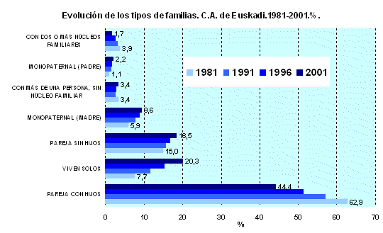 Bilbao, que pierde el 5,4% de su población en diez años, gana 13.480 familias –11,5%-, Vitoria-Gasteiz, que crece un 5,2%, incrementa un 25,7% el número de hogares, evolución muy pareja a la de Donostia-San Sebastián: aumenta un 4% su censo de población y un 22% el de familias. Los principales municipios de la margen izquierda vizcaína como Barakaldo, Portugalete, Santurtzi y Sestao, con pérdidas de población en torno al 10%, aumentan su número de familias desde el 4% del último municipio citado al 11% de Santurtzi.