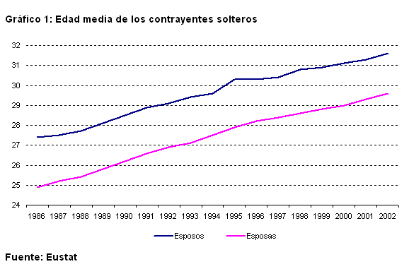 Paralelamente al aumento de la edad de la maternidad, se ha producido un aumento en la edad de los contrayentes. En 2002, la edad media de los varones solteros que contrajeron matrimonio fue de 31,6 años y de 29,6 la de las mujeres solteras. Desde 1986, la edad media de los esposos ha aumentado en 4,2 años y 4,7 en el caso de las esposas.