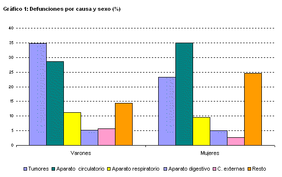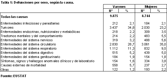 El 31,6% de las defunciones ocurridas en 2002, 5.891 muertes, se debieron a enfermedades del aparato circulatorio; a continuación se situaron los tumores, con un 29,4% (5.467 defunciones), y en tercer lugar, a mayor distancia, las enfermedades respiratorias que supusieron el 10,44% (1.944).