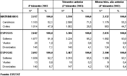 En este trimestre se ha incrementado el número de bodas civiles respecto al mismo período del año anterior, pasando de 953 en 2002 a 1.014 en 2003, según datos de Eustat. Tradicionalmente en estos últimos meses del año se da una mayor proporción de matrimonios civiles (47,9%) que en los meses de verano (28,5%), en los que se celebran casi 4 de cada 10 matrimonios del año. Por el contrario, ha disminuido levemente el número total de bodas.