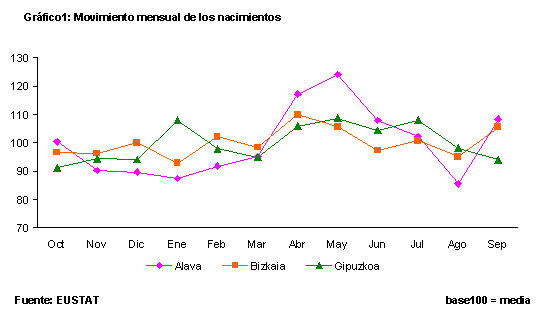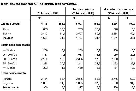 Los datos del tercer trimestre de 2003 de la Estadística de Nacimientos elaborada por EUSTAT dan una cifra de nacidos en la C.A. de Euskadi de 4.746, lo que supone un incremento del 2,5% respecto al mismo período del año anterior. Por territorios, en Álava nacieron 653 niños, con un crecimiento del 4,3%; en Bizkaia, con 2.440 nacimientos, el porcentaje de crecimiento se situó en el 4,5%. Por el contrario, Gipuzkoa disminuyó en una proporción del 1%, con 1.653 nacimientos.