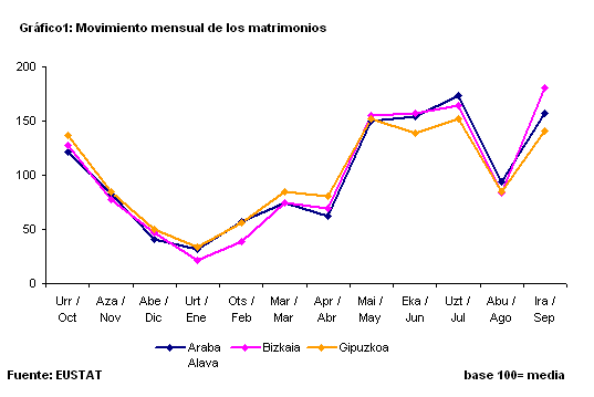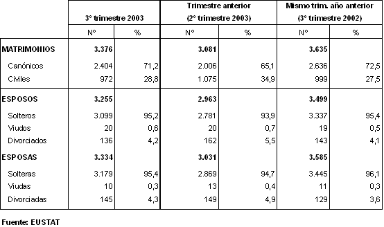 En los meses de julio, agosto y septiembre de 2003 se contabilizaron en la C.A. de Euskadi 3.376 matrimonios, lo que supone una disminución del 7,1% con respecto al mismo trimestre del año anterior. Por territorios históricos, los vizcaínos celebraron 1.728 bodas, seguidos de los guipuzcoanos con 1.029 y los alaveses con 456. En el caso de residentes fuera de la C.A. de Euskadi, el número de bodas ascendió a 163.