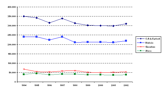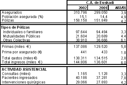 Atendiendo a la modalidad de póliza, la de tipo individual o familiar es la que agrupa al mayor número de asegurados, con el 54,9%, seguida de las pólizas dirigidas a empresas u otros colectivos concretos (25,8%) y las de mutualidades públicas (19,3%). Ahora bien, la póliza colectiva, continuando la trayectoria ascendente de los tres años anteriores (1999-2001), fue la que mayor crecimiento obtuvo (6,1%) respecto a 2001, frente a las individuales o familiares y las mutualidades públicas, con incrementos del 3,3% y 4,4%, respectivamente.