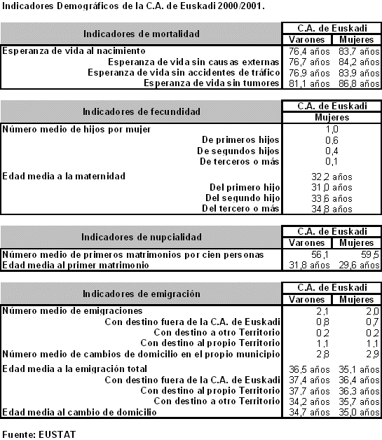 Los varones han ganado 4,10 meses de vida cada año, pasando de los 69,6 años de 1976 a los 76,4 años de 2001, y las mujeres se han beneficiado de 4,13 meses más por año, llegando a los 83,7 años. La diferencia entre las esperanzas de vida de ambos sexos se ha reducido a 7,3 años desde la máxima de 8,7 que se dio hace 10 años. Con estos datos, la C. A. de Euskadi se encuentra a la cabeza de los países desarrollados, especialmente en el caso de las mujeres, en el que se sitúa por encima de los 25 países de la Unión Europea, Canadá y Estados Unidos, sólo siendo superada por Japón.
