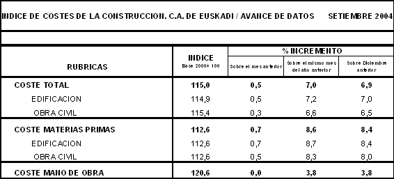 Entre los precios de las materias primas consumidas por el sector que han experimentado mayores tasas de inflación en el conjunto de los últimos doce meses figuran: Tubería metálica (39,3%), Hierro y acero (36,3%), Productos asfálticos (24,8%), Derivados del Petróleo (21,2%) y Artículos derivados del cemento (9,8%), principalmente. Por otra parte, han registrado reducciones en sus precios interanuales (setiembre de 2004 sobre setiembre de 2003) las materias primas de Vidrio (-4,5%), Explosivos y gases (-2,4%), Material de oficina (-1,8%), Energía eléctrica (-0,4%) y Aceites y grasas (-0,1%).