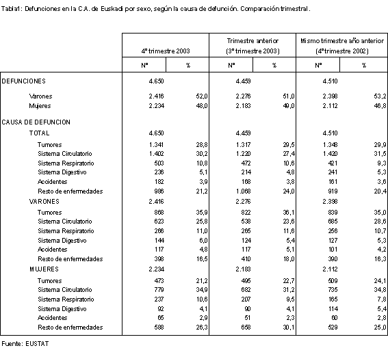 El 30,2% de las defunciones ocurridas en 2003, 5.605 muertes, se debieron a enfermedades del sistema circulatorio. A continuación se situaron los tumores, con un 29% (5.375 defunciones) y, en tercer lugar, a mayor distancia, las enfermedades respiratorias, que supusieron el 10,7% (1.987).