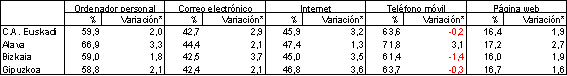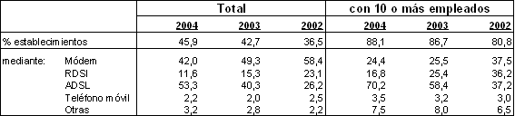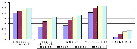 Si se tiene en cuenta el tamaño de los establecimientos, variable que introduce un elemento primordial de diferenciación entre ellos, los de menor tamaño (0-9 empleados) continúan teniendo el equipamiento más bajo, oscilando éste entre el 13,3% de los establecimientos que disponen de página web y el 62,2% de los que tienen teléfonos móviles, pasando por el 39,1% con correo electrónico, el 42,6% que tienen acceso a Internet y el 57,1% que poseen ordenadores. Las diferencias van, sin embargo, atenuándose como consecuencia de las mayores tasas de crecimiento en comparación con el resto de las empresas, al partir de niveles sensiblemente inferiores. Excepto en teléfonos móviles, que son similares, crecen entre 2 y 3 puntos porcentuales respecto al año anterior.