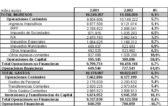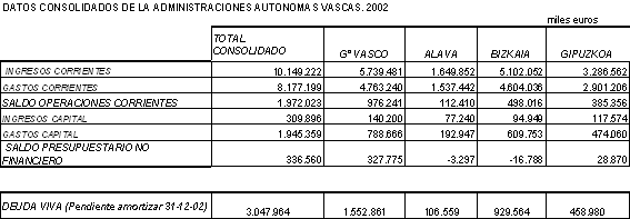 Los gastos corrientes de las Administraciones Autónomas Vascas formadas por el Gobierno Vasco, las Diputaciones Forales y las Administraciones Municipales, junto a sus correspondientes Organismos Autónomos y Entidades Supramunicipales, han experimentado una subida del 6,7% en el ejercicio de 2002, según datos elaborados por Eustat, contabilizándose en 8.177,1 millones. Los ingresos corrientes, por su parte, han registrado un aumento del 5,7% en el mismo período anual, ascendiendo a 10.149,2 millones.