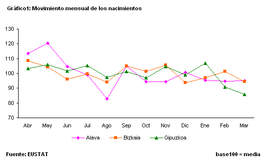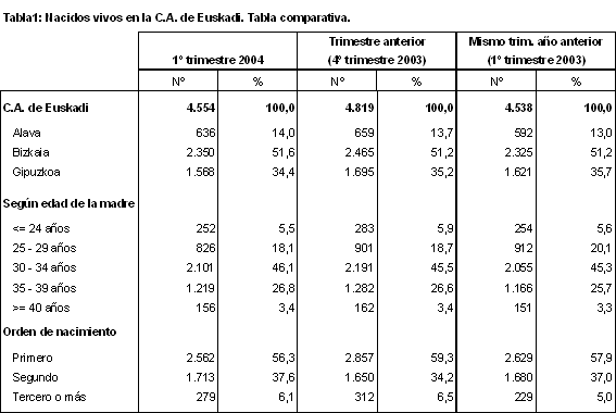 En la distribución de los nacimientos según la edad de la madre, continúa manteniéndose una clara preponderancia del grupo de madres de 30-34 años, entre las que se produce casi la mitad de los alumbramientos. A este grupo le sigue el inmediatamente superior de 35-39 años con el 26,8%, superando al grupo de 25-29 años que aporta el 18,1%. En los grupos de edades extremas, el de menores de 25 años supone el 5,5%, mientras que el de mayores de 40 únicamente aporta el 3,4% de los nacimientos.