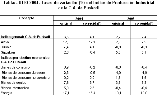 La producción industrial de la C. A. de Euskadi en julio de 2004 aumentó un 6,5% en tasa interanual, según datos elaborados por EUSTAT. En términos homogéneos, corregido de los efectos de calendario, la variación interanual ha sido del 4,1%. El crecimiento acumulado de los siete primeros meses del año se sitúa en el 4,6% en términos absolutos y en el 3,4% en términos homogéneos.