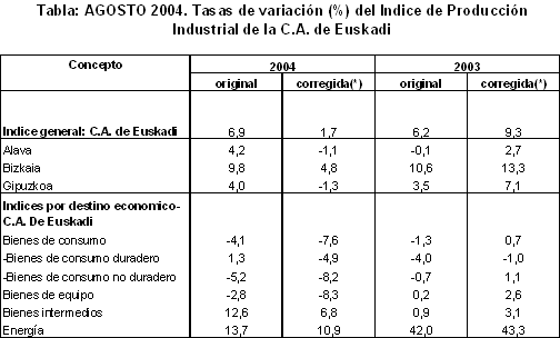 La producción industrial de la C. A. de Euskadi en agosto de 2004 aumentó un 6,9% en tasa interanual, según datos elaborados por EUSTAT. En términos homogéneos, corregido de los efectos de calendario, la variación interanual ha sido del 1,7%. El crecimiento acumulado de los ocho primeros meses del año se sitúa en el 4,8% en términos absolutos y en el 3,3% en términos homogéneos.