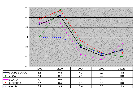 La actividad industrial de la C.A. de Euskadi ha obtenido un crecimiento real de su valor añadido del 1,4% en 2003, mejorando el registro obtenido el año anterior (+0,2%), según datos elaborados por Eustat. Este comportamiento no se ha reflejado de la misma forma en los tres territorios, creciendo Bizkaia y Gipuzkoa a unas tasas reales del 2,7% y 0,8%, respectivamente, y manteniéndose en los niveles del año anterior en Alava.