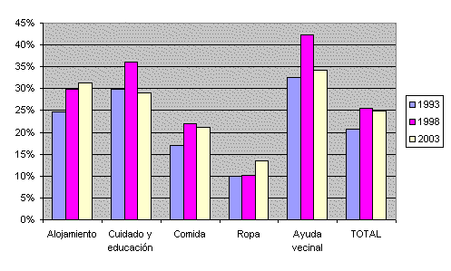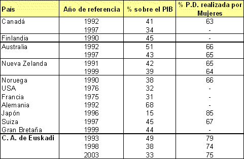 Si se atiende a la situación laboral de la población que realiza el trabajo doméstico no remunerado, éste se distribuye de la siguiente manera: el 53,5% es realizado por la población que se clasifica como “Sus labores”, el 26,3% es realizada por los “Ocupados”, el 13,2% por los “Jubilados”, el 4,1% por los “Parados”, el 1,1% por los “Estudiantes” y el resto por “Otros”. Existe un gran desequilibrio entre el peso de las poblaciones de los distintos grupos y su participación en el trabajo doméstico, especialmente evidenciado entre los “Ocupados”. Las diferencias por género nuevamente se remarcan dentro de este análisis, y más significativamente entre los “Estudiantes”, donde la mujeres desarrollan un 83% de trabajo frente a un 17% los varones. Los ”Jubilados” por su parte es un colectivo con un menor desequilibrio entre los géneros.