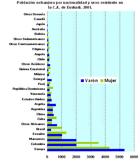 El 50% de los extranjeros se concentra en las tres capitales; en concreto, el 23,6% opta por residir en Bilbao, el 17% en Vitoria-Gasteiz y el 10% en Donostia-San Sebastián. El 54,3% de este colectivo con 16 o más años está ocupado y el 12,9% carece de empleo. Esta cifra representa una tasa de paro del 19%, frente al 11,6% del conjunto de la población en 2001. Sólo un 32,8% son inactivos; de ellos, el 14% se dedica a labores del hogar, un 9% cursa estudios y el resto está en alguna otra situación de inactividad (jubilados, incapacitados para trabajar, etc.). El porcentaje de inactivos en el conjunto de la C.A. de Euskadi asciende al 53,1% de la población.