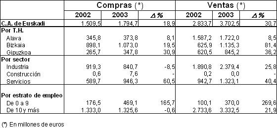 El volumen de negocio generado en el año 2003 a través de la red o mediante otros sistemas electrónicos (EDI, Intercambio de datos electrónicos, etc.) ascendió a 3.702,5 millones de euros en cuanto a ventas electrónicas realizadas y a 1.794,7 millones en lo que hace referencia a compras efectuadas, según datos elaborados por Eustat.