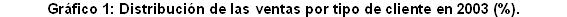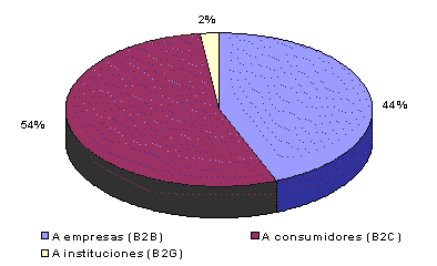 Por lo que respecta al tipo de cliente al que se han destinado las ventas en el comercio electrónico en el año 2003, el 44% del total de ventas electrónicas ha ido destinado a otras empresas (el comercio denominado B2B), el 54% ha tenido como destinatarios consumidores particulares (B2C) y el 2% restante se ha repartido entre otros destinos, como Administraciones Públicas (B2G).